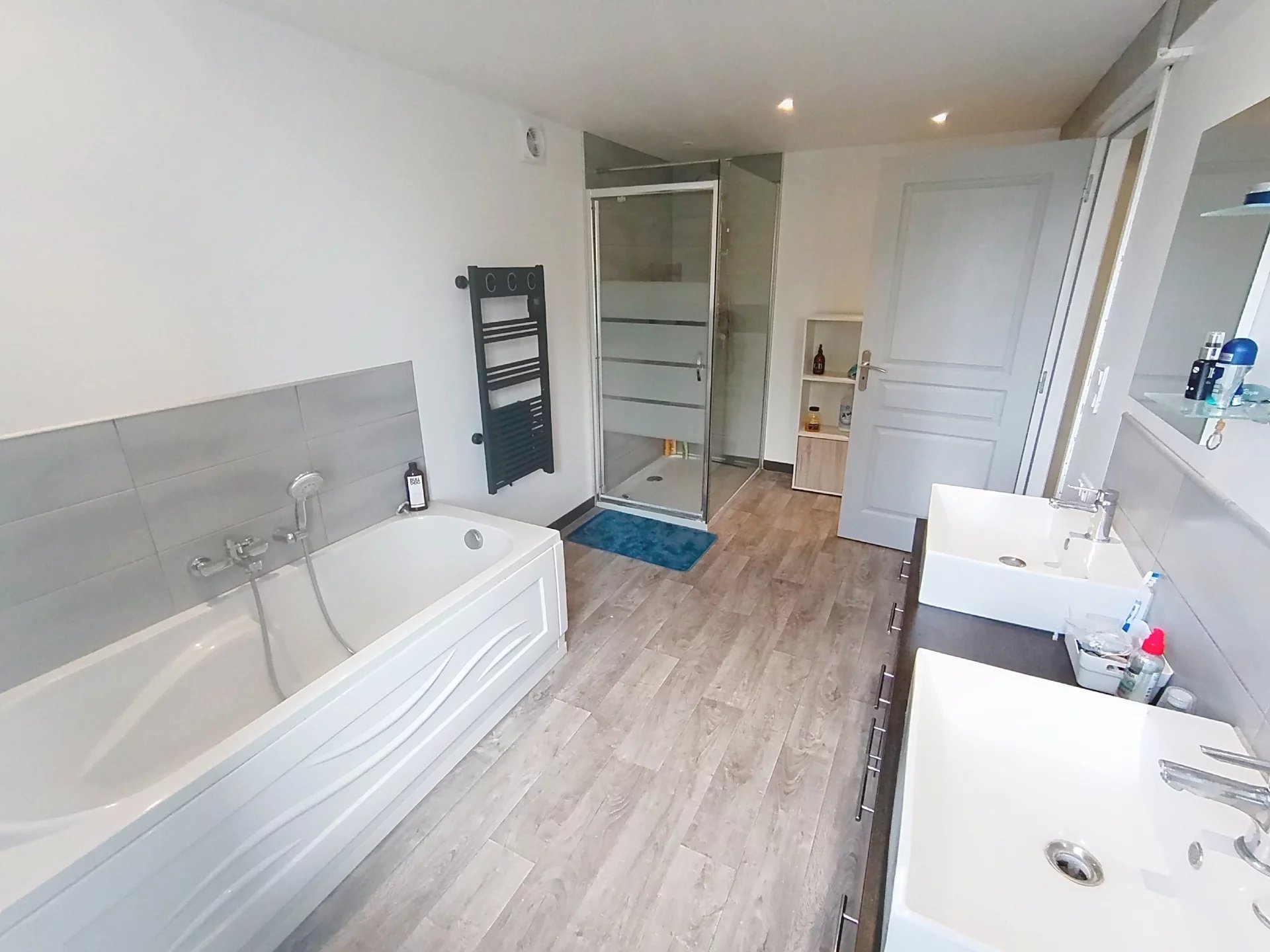 Au premier étage un magnifique palier de 27m² pouvant servir de salle de jeux ou de coin lecture, trois chambres comprise entre 11m² et 15m² ainsi qu'une spacieuse salle de bain avec WC de 10m², équipée à la fois d’une baignoire et d’une douche.