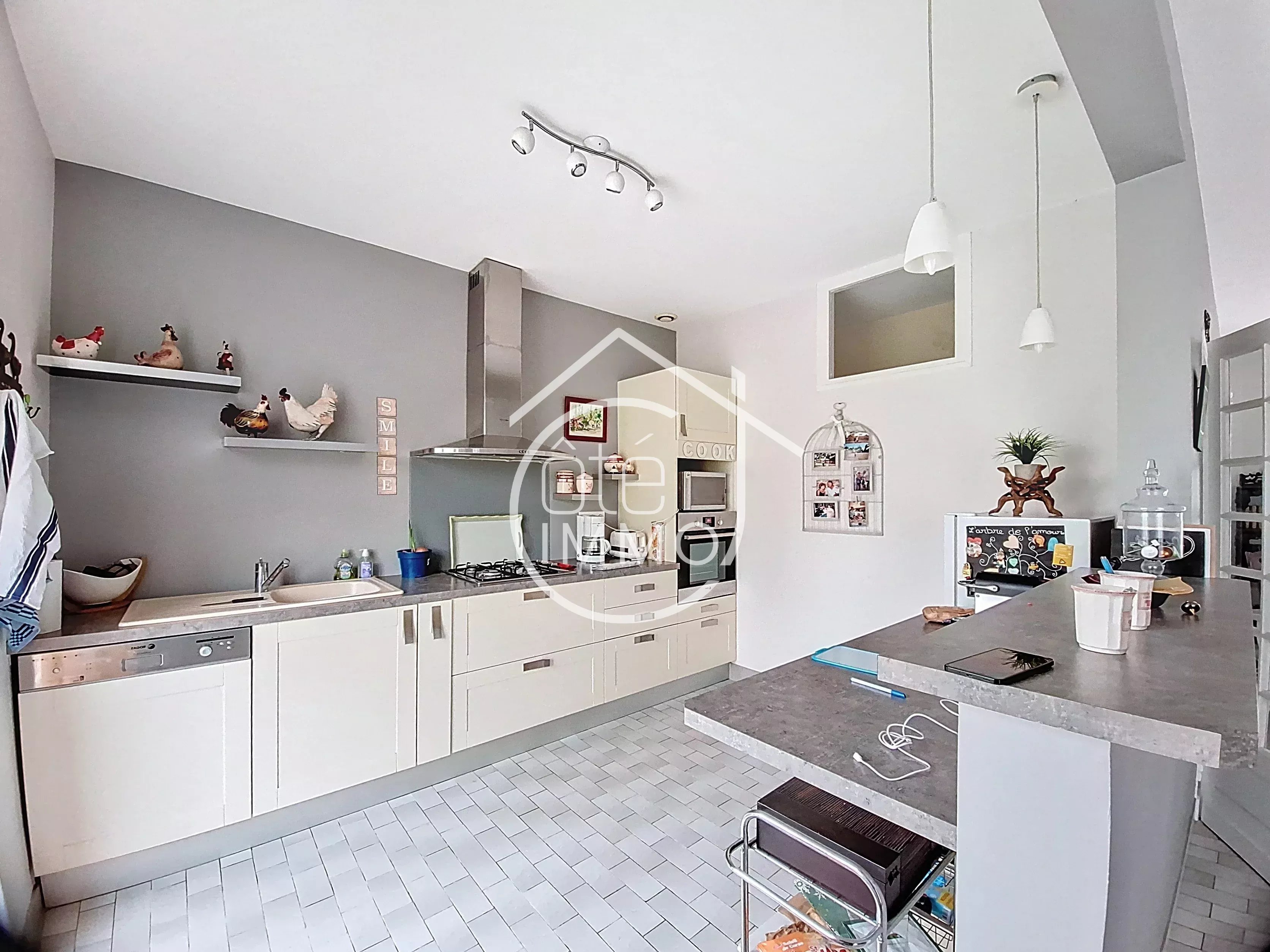 Dès l’entrée, vous découvrirez un espace de vie chaleureux et lumineux, composé d’un séjour avec insert, ouvert sur une cuisine semi-ouverte conviviale — parfait pour partager de bons moments en famille ou entre amis.